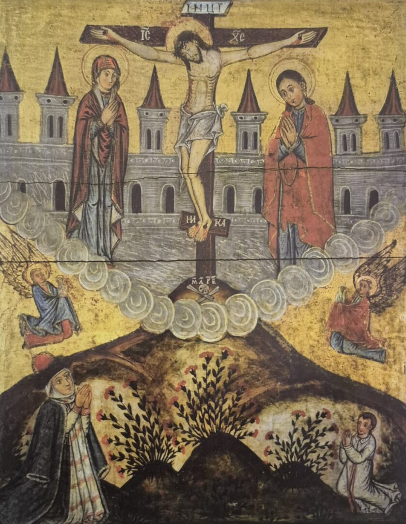 Gdyby zmrużyć oczy, całą scenę Ukrzyżowania z radrużańskiej ikony można by wpisać w kształt klepsydry. Zawieszone na krzyżu ciało Chrystusa wyznaczałoby strużkę przesypującego się piasku. W tle majaczą mury Jerozolimy, których wieże przypominają ogromne, wymierzone w niebo ciernie. Pod krzyżem stoją Maria i Jan Ewangelista – spokojni, skupieni, trwający w milczeniu.